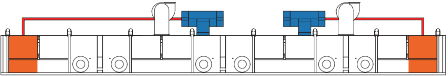 分別使用2個余熱回收將加熱后的新風(fēng)送至第一節(jié)和后一節(jié)烘房